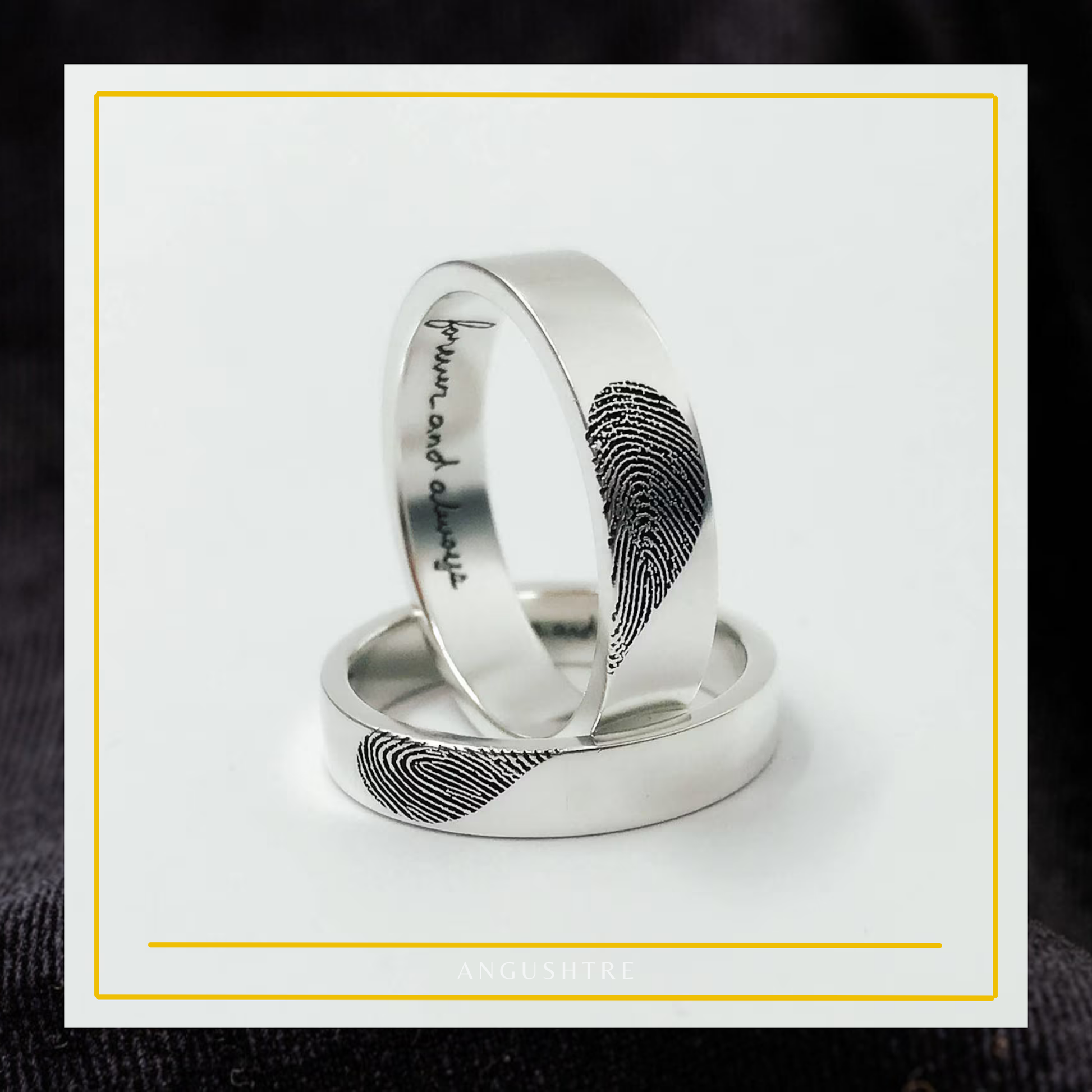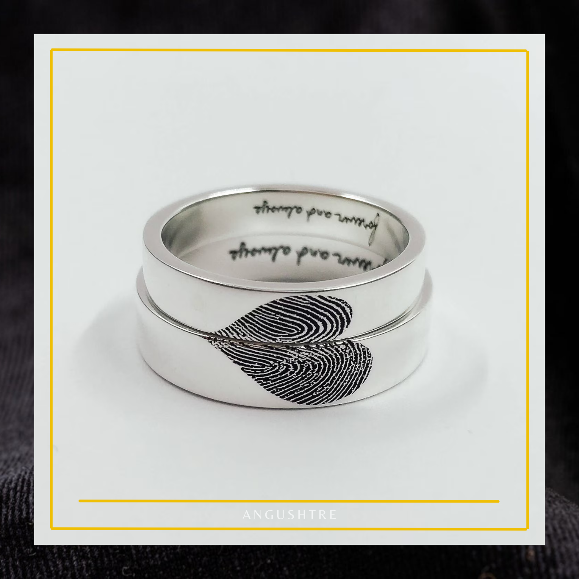 Each ring is laser-engraved with your authentic fingerprint and can include names, initials, dates, or short messages inside or outside the band.